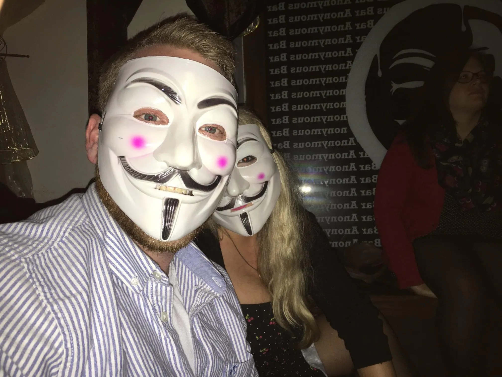 Sporting our Guy Fawkes' masks